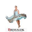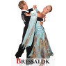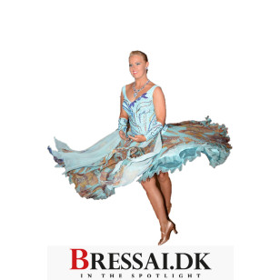Standard kjole i Aqua lycra stræk net over, dekoreret med mønstre stenet i Swarovski, Radiance, Lumie krystaller i mange blålige, og gyldne farver.