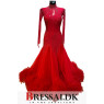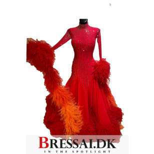 Skørtet er afsluttet med 6 ply strudse boa, ligeså er der manchetter med boa, og hængende svæv i bos der løver i farverne, der er brugt på standardkjolen.