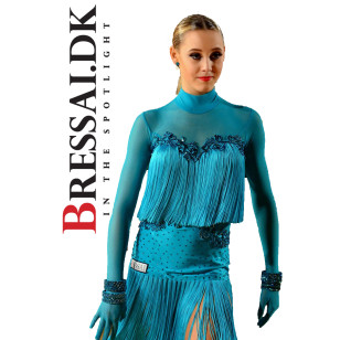Fangende latin kjole i Jade lustre lycra, med stræk net ærmer med handsker, dekoreret med frynser, fuldstenet blonder, og et levende frynseskørt.